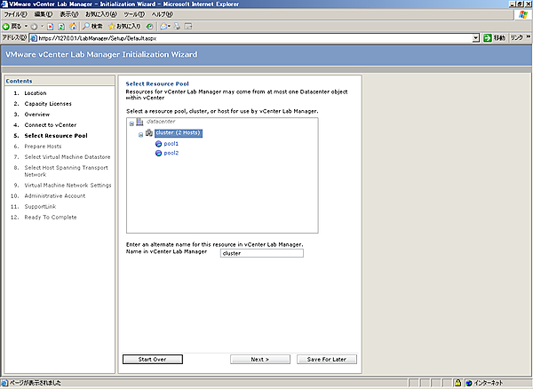 [1-5][Select Resource Pool]画面では、Lab Managerで使用するリソースプールを選択し、[Next]をクリックします。ここではクラスタを選択しています。初期設定の段階では1つのオブジェクトしか選択できません。詳細なリソースプールの設定は、初期セットアップ後に実施します。選択できる対象としては、ESX(i)ホスト、リソースプール、クラスタがあります。