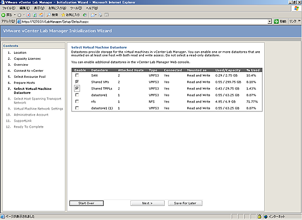 [1-7][Select Virtual Machine Datastore]画面では、Lab Managerから利用させるデータストアを選択し、[Next]をクリックします。この画面で選択しなかったデータストアも、初期セットアップ後に有効にすることは可能です。