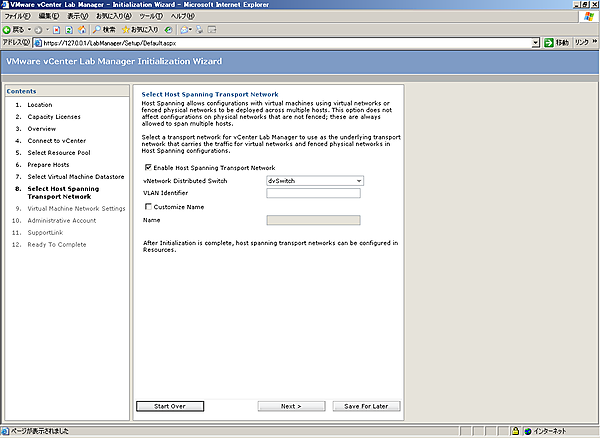 [1-8][Select Host Spanning Transport Network]画面では、ホストスパニングの機能を利用するかどうかの設定を行い、[Next]をクリックします。vDSを作成している場合は、[Enable Host Spanning Transport Network]にチェックを入れ、[Next]をクリックします。ホストスパニングを使用するには、vSphere Enterprise plusのライセンスおよびvDSの事前設定が必要です。vDSを使用していない場合は、デフォルトのまま[Next]をクリックします。