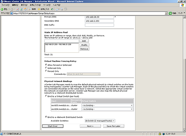 - - Physical Network Bindings……Lab Managerから使用するネットワークのうち、物理ネットワークと通信できる仮想スイッチを選択。vSSを使用している場合は、[Bind to a Virtual Switch(per host)]を選択し、ESX(i)ごとに、仮想スイッチを選択。vDSを使用している場合は、[Bind to a vNetwork Distributed Switch]を選択し、vDSを選択