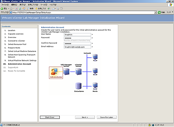 [1-10][Administrative Account]画面では、Lab Managerの管理者アカウントを入力し、[Next]をクリックします。