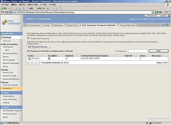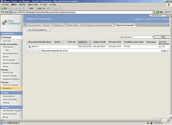 物理ネットワークは、外部と通信できるネットワークです。Lab Managerでは、ESX(i)上の外部と通信できる仮想スイッチを、Lab Manager上の物理ネットワークというオブジェクトに対してマッピングします。この設定もLab Managerの初期設定時に実施しており、ネットワークのvDSをLab Manager上の物理ネットワークとして登録しています。そのため、ここでは物理ネットワークが登録されていることを確認します。