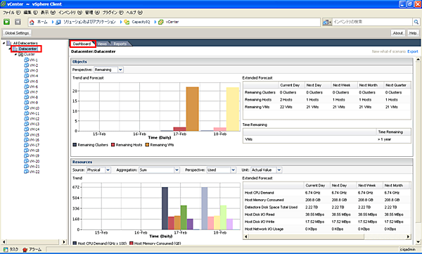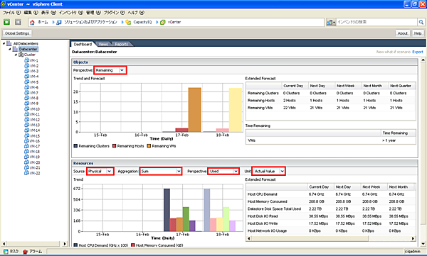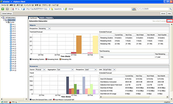 [1]まずは[Objects]欄や[Resources]欄でエクスポートしたい表示を指定します。たとえば、[Remaining(残リソース)]、[Physical(ESX/ESXiの使用量)]、[SUM(全体の使用量)]などを選択します。続いて、[Dashboard]画面右上の[Export]をクリックします。