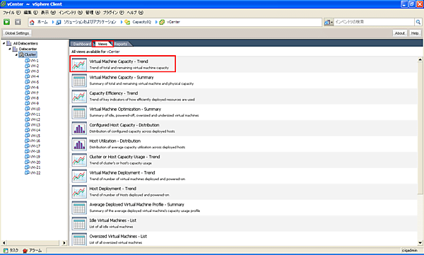 - 展開されている仮想マシンの台数やこれから展開可能な仮想マシン数を表示します。[Datacenter][Cluster]欄で表示可能。