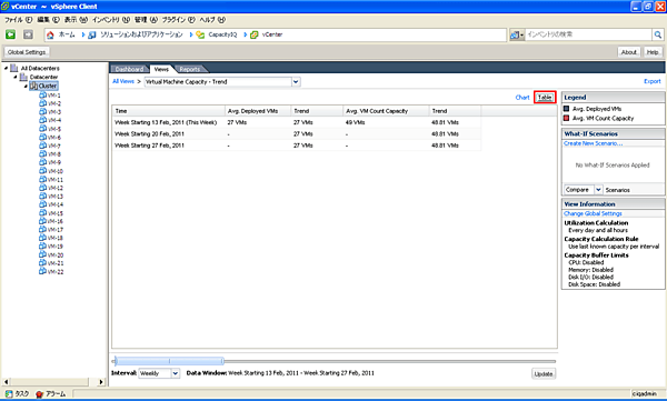 [View]タブ画面では、表とグラフの表示を切り替えることが可能です。たとえば、[Virtual Machine Capacity Trend]では、右隅の[Table][Chart]をクリックすることで、表形式とグラフ形式を切り替えられます。