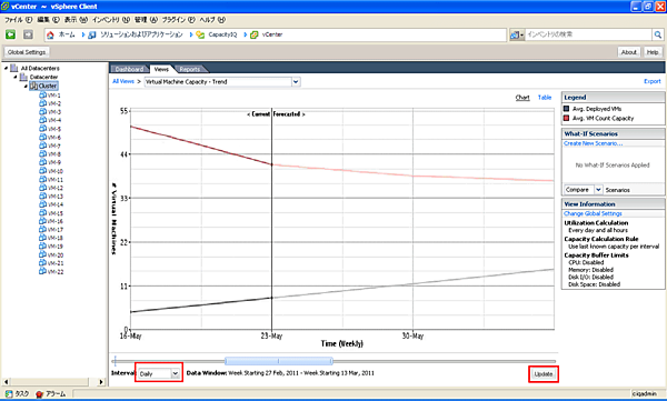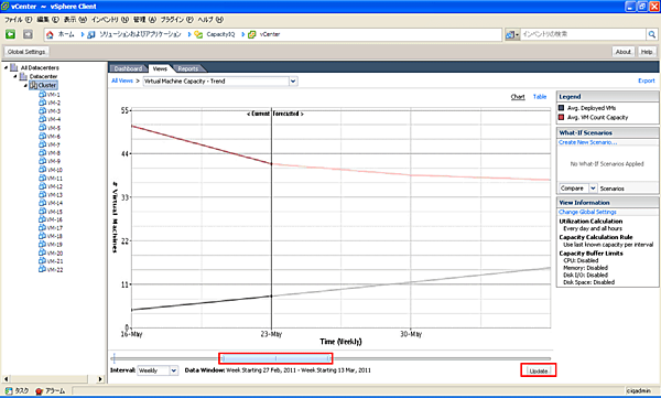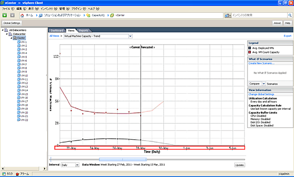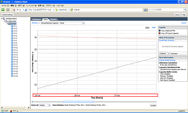 - 展開されている仮想マシンの台数やこれから展開可能な仮想マシン数の過去から今までの変遷と、将来の予測を表示します。[Datacenter][Cluster]欄で表示可能。