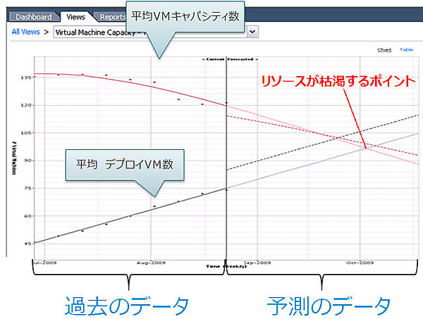また、What-ifシナリオ(詳細は後述)を利用すると、仮想マシンやESX/ESXiホストを追加・削除したりした場合に、リソースが枯渇するポイントがどのように変化するかをシミュレーションすることができます。点線がそのシミュレーションに相当する部分です。