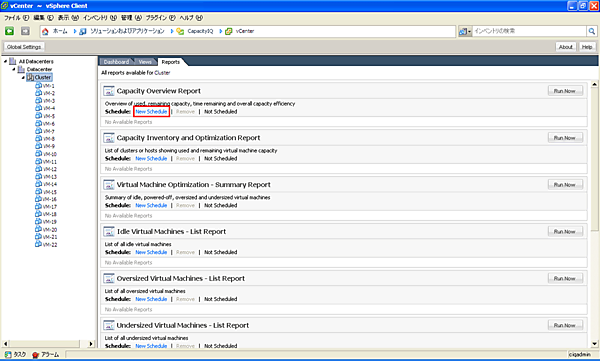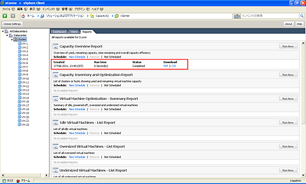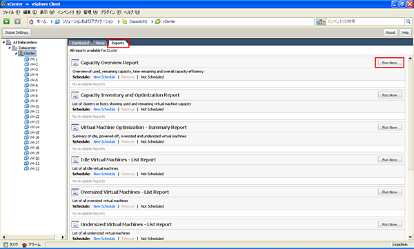 [1]CapacityIQ管理画面(画面3)のインベントリから、レポートを出力したいオブジェクトを選択します。以下の画面のように、[Report]タブをクリックしてから、出力したいレポートの[Run Now]ボタンをクリックします。