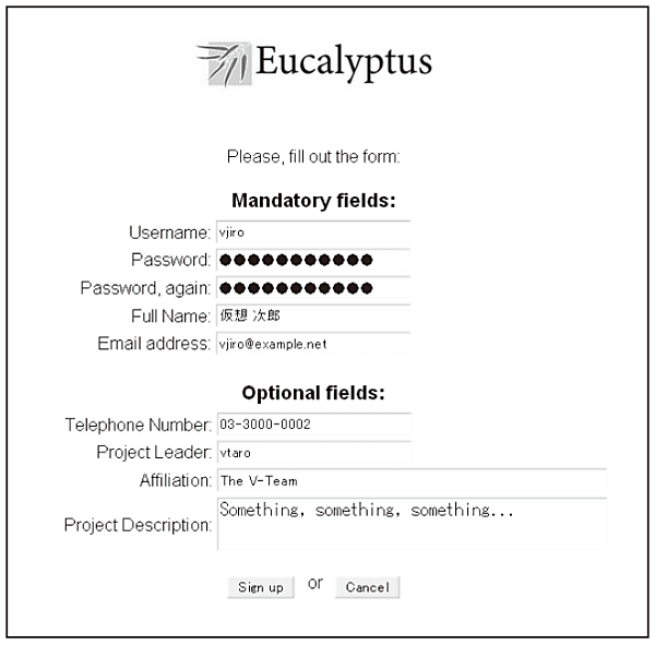 各項目に適宜情報を入力し、[Sign up]ボタンを押すと、ユーザー作成の申請を受け付けた旨のメッセージが表示されます( 図7 、各項目の説明は付録A を参照してください)。