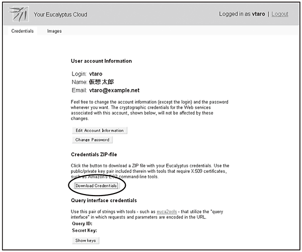 CUI(Euca2ools)を利用するには、X.509 の証明書やユーザー情報などが入ったzip ファイルを用意する必要があります。ユーザー「admin」はCLC で euca_conf コマンドあるいは euca-getcredentialsコマンドを用いてこのzip ファイルを取得できますが、それ以外のユーザーはWeb 管理画面からダウンロードする必要があります。