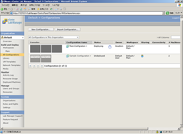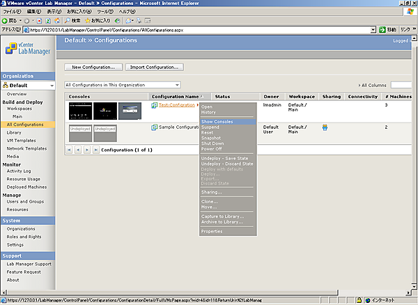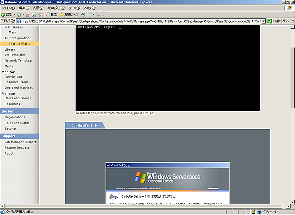 Lab Managerは基本的にはユーザーが自由にコンフィグレーションを作成し、コンフィグレーション内の仮想マシンをユーザーに自由に使用させるという使い方になります。そのため、ここまでの手順が実施できていれば、Lab Managerの基本的な使い方はマスターできていると考えてよいでしょう。