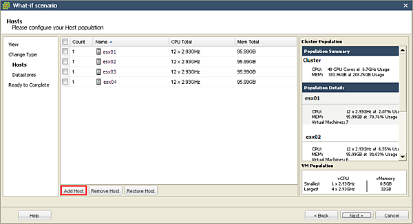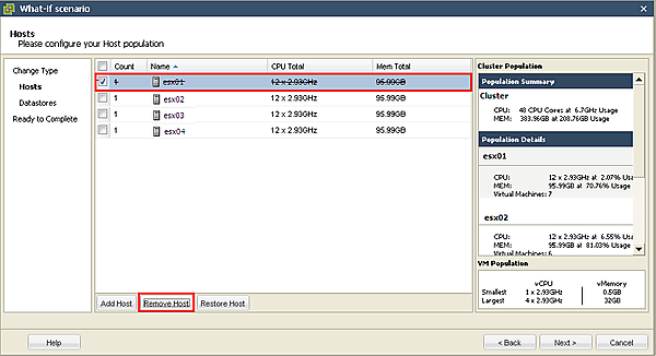 [4-6]既存のESX/ESXiホスト名のチェックボックスをチェックにして、[Remove Host]をクリックすると、ESX/ESXiホストを削除(撤去)した場合のシナリオを作成できます。