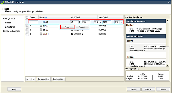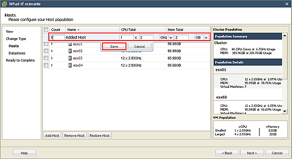 [4-4][Name]欄が[Added Host]となる行が追加されるので、その行において追加するESX/ESXiホストの台数とスペック(CPUとメモリ)を指定して[Save]ボタンをクリックします。