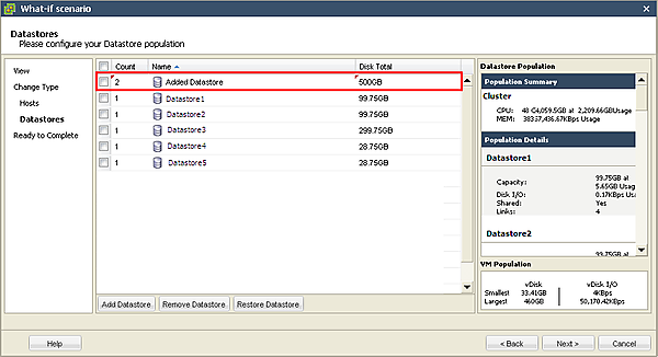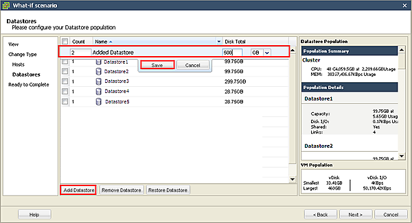 [4-8]データストアを追加する場合は、[Add Datastore]をクリックします。[Name]欄が[Added Datastore]の行が追加されるので、追加するデータストアの個数とディスク容量を指定して[Save]ボタンをクリックします。データストアの容量(スペック)の変更や、データストアの削除を行う場合、その手順はESX/ESXiホストの例と同様です。