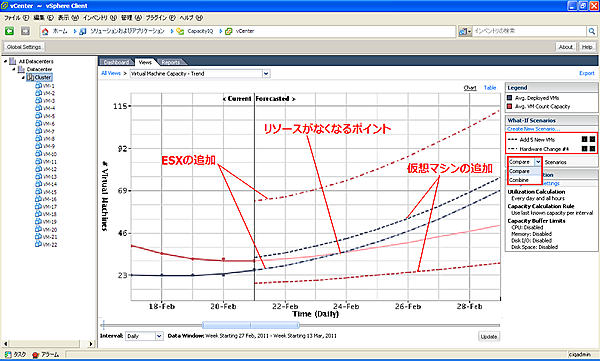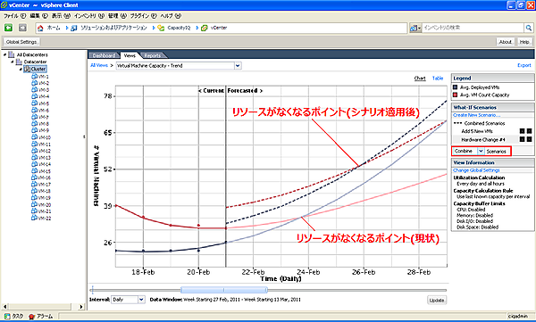 同じクラスタに対して作成したシナリオを結合(Combine)することで、1つのシミュレーションにすることが可能です。例えば、「仮想マシンを追加するシナリオ」+「ESX/ESXiホストを追加するシナリオ」 = 「ESX/ESXiホストをxx台追加した場合に、あと仮想マシンを何台追加できるかのシミュレーション」を作成することが可能です。