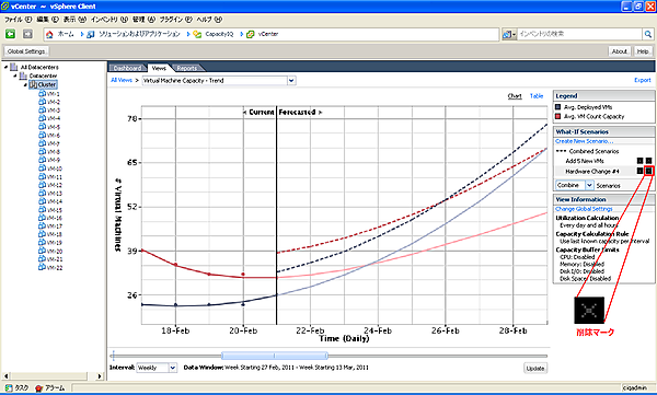 [5-1][View]タブを選択して[Virtual Machine Capacity - Trend]のWhat-ifシナリオ画面を開きます。画面右の[What-if scenarios]欄でドロップダウンリストから[Combine]を選択すると、現在作成されているシナリオ同士を結合します。ここで結合するシナリオは、「Add 5 New VMs」と「Hardware Change #4」です。