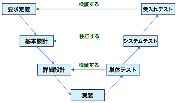 図2では、下流にテスト工程が存在しています。しかし、実際の開発では、単体テスト、システムテスト、受け入れテストといった様々なテストを行います。これらのテストは上流工程と対応しており、図3のようなV字を描くことができます。