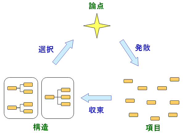 論点を選択したら、論点から思い付くことを自由に発想していきます。この過程を『発散』と呼びます。思い付くままに意見や要素などの『項目』を洗い出します。思い付くことは全て書き出し、記録するくらいのつもりで連想していくと効率的です。もし何も思い付かない場合には論点が曖昧すぎるのかもしれません。