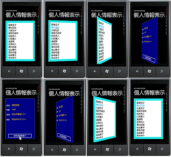 実行すると、ListBoxに氏名の一覧が表示されています。任意の氏名をクリックまたはタッチ(タッチスクリーンの場合)すると、画面が回転して裏を向き、選択した人物の詳細データが表示されます。また[名前選択画面へ]ボタンをクリックすると、画面が回転して氏名の選択画面に戻ります(図1)。