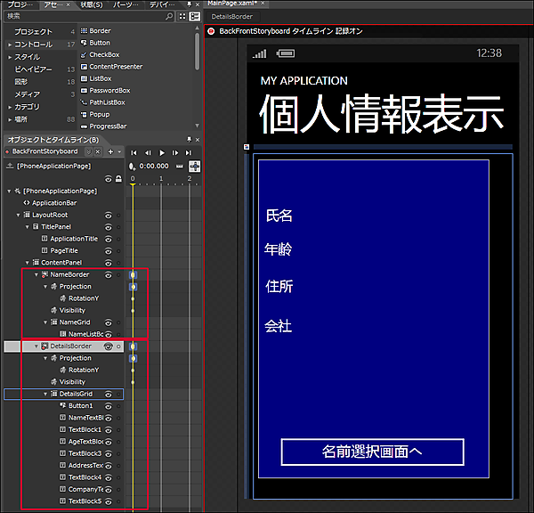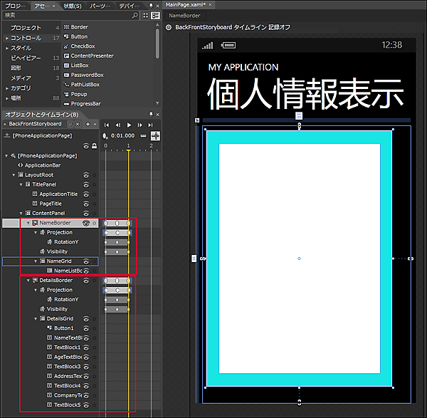| 図11: 再生ヘッドが0の位置での、NameBorderとDetailsBorderの各プロパティの値を設定した。最初は、裏の面が表示されている(クリックで拡大) |