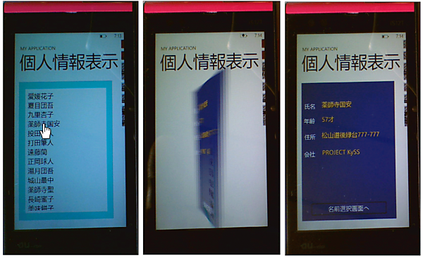 各TextBlockのTextプロパティに、ListBoxより選択された項目のインデックス(SelectedIndex)に該当する、<情報>要素の子要素<氏名>、<年齢>、<住所>、<勤務先>の値を指定します。そして、裏面が表示されるFrontBackStoryboardをBeginメソッドで開始します。