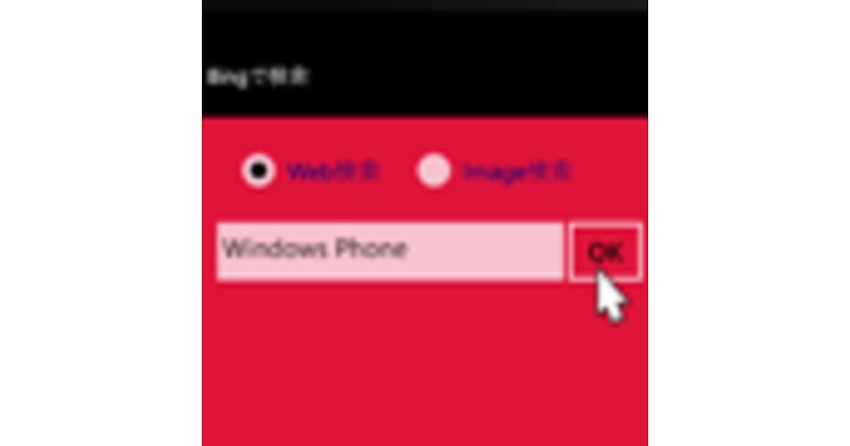 実行すると、デフォルトで「Web検索」にチェックが付き、その下に入力ボックスが表示されます。入力ボックスに「Windows Phone」と入力して[OK]ボタンをクリックします。検索結果が表示されますので、任意のサイトをクリックすると、該当するページが表示されます。表示されたページは、タッチスクリーン使用の場合は、2本の指で拡大、縮小が可能です(図1)。ページの切り替え時にはPage Transition効果を使用しています。