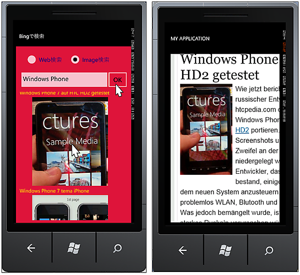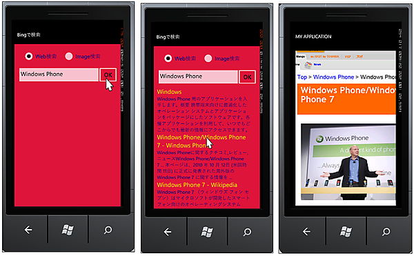 次に「Image検索」にチェックを付けて「Windows Phone」と入力された状態で[OK]ボタンをクリックすると、該当する画像が表示されます。任意の画像をクリックすると該当ページがPage Transition効果を伴って表示されます(図2)。このサンプルにはBing APIを使用しています。