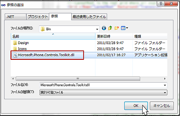 | 図6:「参照」タブからMicrosoft.Phone.Controls.Toolkit.dllを指定した(クリックで拡大) |