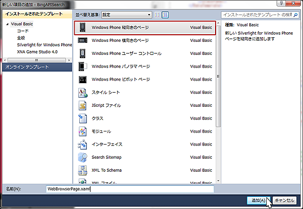 VS2010メニューの「プロジェクト(P)/新しい項目の追加(W)」と選択して、「Windows Phone 縦向きのページ」を選択し、「名前(N)」にWebBrowserPage.xamlと指定して、[追加(A)]ボタンをクリックします(図8)。このページには選択したサイトが表示されます。