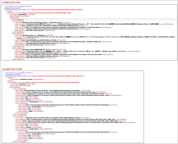 | 図10:「Web検索」「Image検索」で返されるXML(クリックで拡大) |