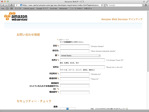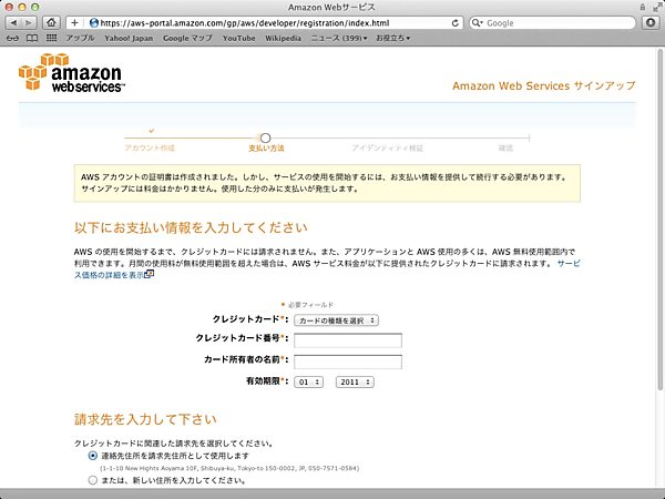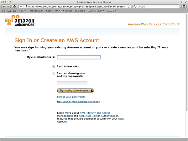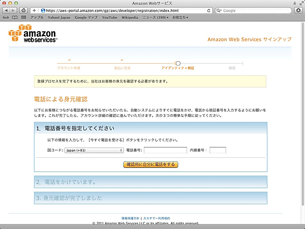 Amazon EC2(以下、EC2)を使用するためには、Amazon Web Services(以下、AWS)へのサインアップを行う必要がある。サインアップのために用意するものは、メールアドレスと使用料の決済のためのクレジットカード、そして本人確認を行うための電話番号が必要となる。電話番号は携帯電話でも構わない。