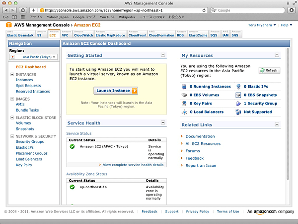 Amazon Management Consoleからインスタンスを作成する。「Amazon EC2 Console Dashboard」から「Launch Instance」をクリックすると、インスタンス作成のウイザードが起動する。