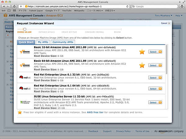 インスタンスで使用するOSを選択する。ここでは「Basic 32-bit Amazon Linux」を選択する。