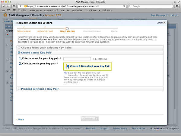 鍵の名前を指定し、「Create & Download your Key Pair」をクリックする。秘密鍵(○○.pem)がダウンロードされてくるので、適切な場所に保管しておく。