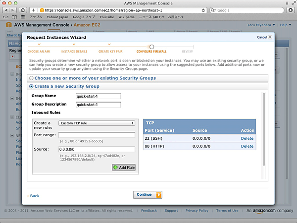 後ほどWebサーバーを動作させるので、Port rangeを80に指定したルールを追加しておく。