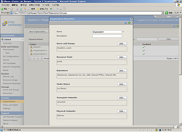 [Global]という組織は、Lab Manager全体を管理する組織です。組織を作成するためには、[Global]という組織から操作を行う必要があります。Lab Managerセットアップ時に指定した管理者のみが[Global]組織へのアクセス権があります。