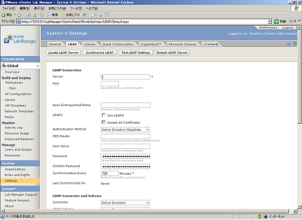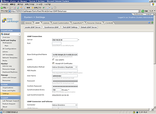 以上でLDAPサーバの設定は完了です。今回の構成では、AD上にlmusersというグループを作成しています。そのグループをLab Managerにインポートすることが可能です。手順は以下のとおりです。