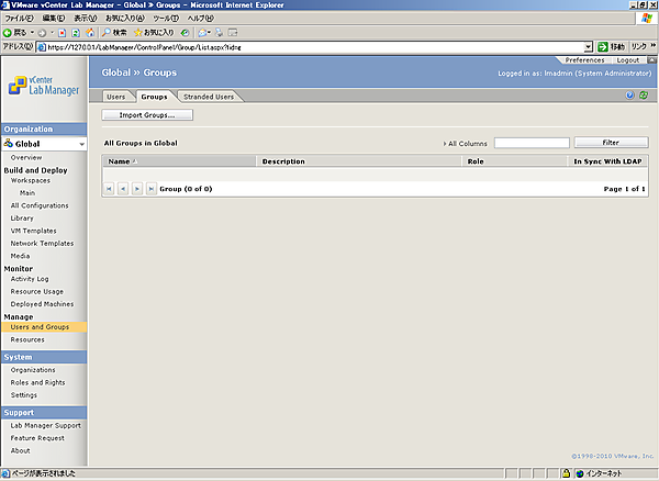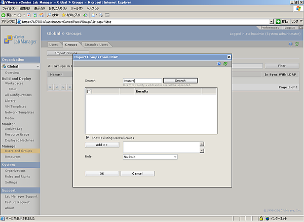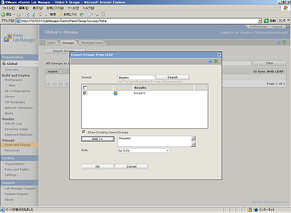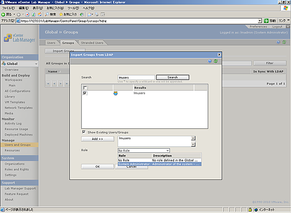 以上でLDAPサーバ上のグループのLab Managerへのインポートは完了です。今後、割り当てられたロールの持つ権限をグループに所属するユーザーは実行できるようになります。