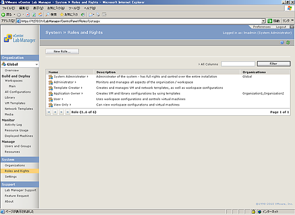 先にLab Managerへのユーザー、グループの割り当ての方法を紹介しました。ユーザーもしくはグループを組織に割り当てる際には、ロールというものを定義する必要があります。ロールとは、権限の集合体です。ユーザーは、自分に割り当てられたロールが持つ権限を実際に実行することが可能です。Lab Managerではデフォルトで6つのロールが用意されています。
