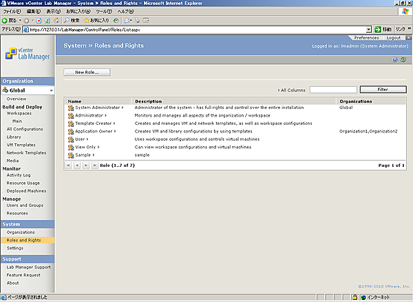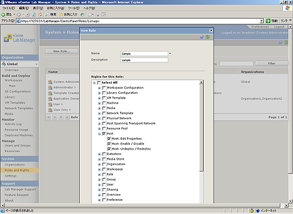 ロールについては、Lab Managerの左ペインで[Roles and Rights]から確認および新規にロールの作成が可能です。ロールを作成しておけば、組織にユーザー、グループを割り当てる際に、ロールの選択肢の中に項目が追加されます。以下はロール作成の手順です。