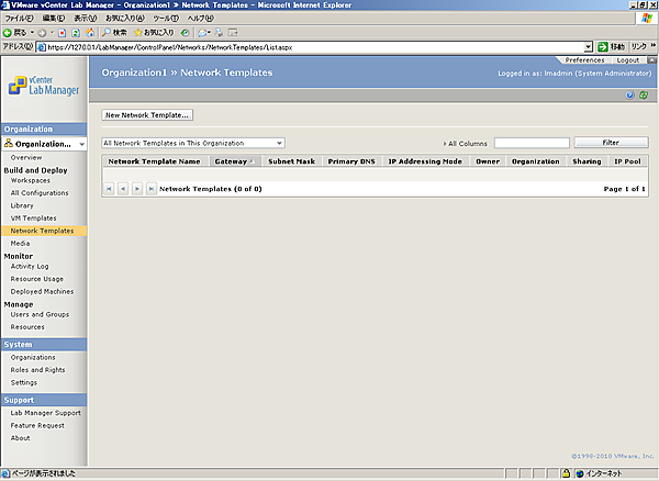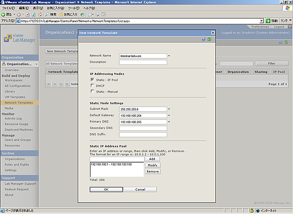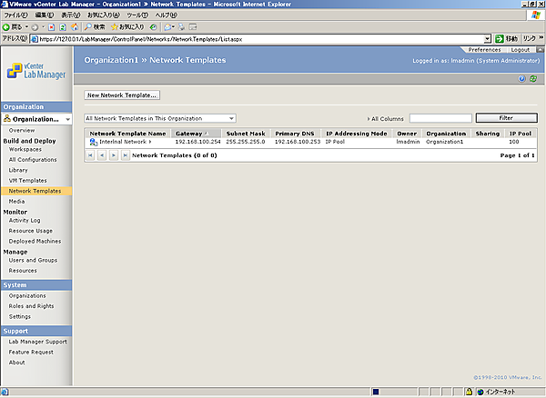 ネットワークに関して、初期セットアップ時には物理環境と通信のできる物理ネットワークの設定を行いました。これまではコンフィグレーションを作成するときにはその物理ネットワークだけを利用しましたが、物理ネットワークには接続する必要のないコンフィグレーションも存在するでしょう。その場合は、Lab Managerではネットワークテンプレートを作成することで、外部と疎通しないインターナルの環境を作成できます。また必要であれば、内部ネットワークにコンフィグレーションは接続し、外部ネットワークにマッピングすることで内部ネットワークに接続しながら外部と通信できるようにすることも可能です。