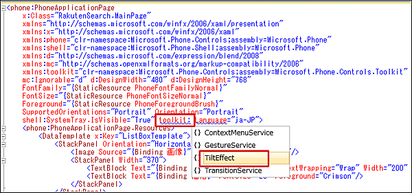| 図6:< phone:PhoneApplicationPage >要素内にtoolkit:と入力するとインテリセンスが機能し、TiltEffect.IsTileEnabled=”True”と選択することができる(クリックで拡大) |