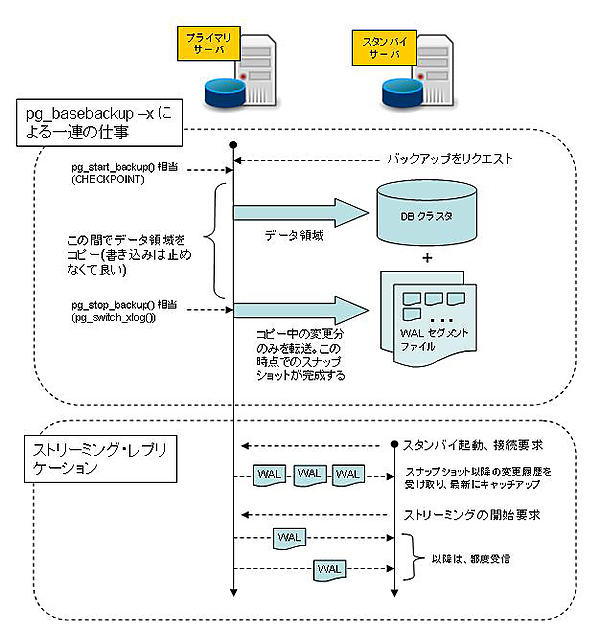 | 図1:"pg_basebackup -x" と、レプリケーション開始の流れ(クリックで拡大) |