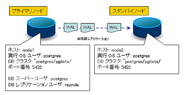 以上が各ホストに共通の設定となり、ここから先がプライマリの設定となります。データディレクトリ下のファイルは pg_basebackup でレプリケーション・ベースをコピーする際に同時にコピーされますので、可能な限りプライマリ上で前もって設定をし、後でそれらをスタンバイ側へコピーするようにします。