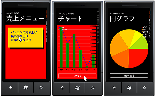 最初に、Windows Phoneのプログラムを実行します。実行すると「売り上げ」のメニューが表示されます。このメニューの中から、今回は「魚の売り上げ」を選択してみます。すると棒グラフが表示されます。[円グラフ]ボタンをクリックすると円グラフが表示されます(図3)。
