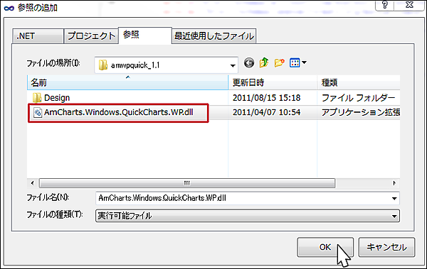 | 図4:「参照」タブから「AmCharts.Windows.QuickCharts.WP.dll」を指定する(クリックで拡大) |
