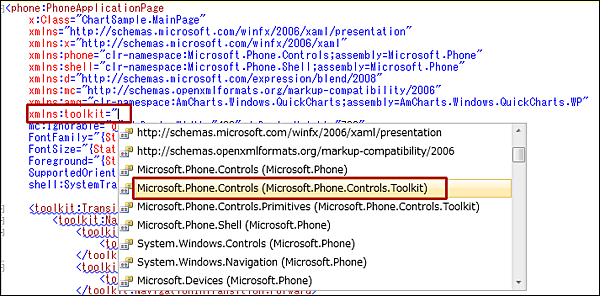 これらの名前空間の値は、「参照の追加(R)」から、Microsoft.Phone.Controls.Toolkit.dllやAmCharts.Windows.QuickCharts.WP.dllを追加していなければ表示されませんので、注意してください。