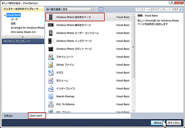 VS2010メニューの「プロジェクト(P)/新しい項目の追加(W)」と選択して、「Windows Phone 縦向きのページ」を選択します。「名前(N)」には「Chart.xaml」指定し、[追加(A)]ボタンをクリックします(図8)。