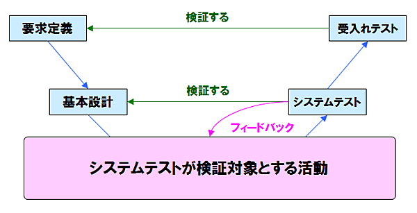 フィードバックには活動の方向性を修正する意図があります。受け入れテストの結果に応じて活動の方向性が修正されるのは基本設計からシステムテストまでとなるため、受け入れテストは基本設計からシステムテストまでの活動に対するフィードバックを生むことになります(図2)。