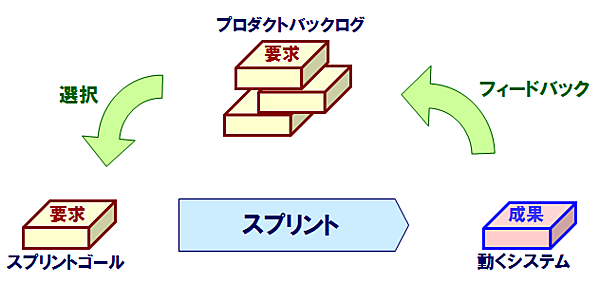 スクラムはV字モデルにおけるフィードバックの問題を解消します。図5はスクラムの大枠の流れを示した図です。